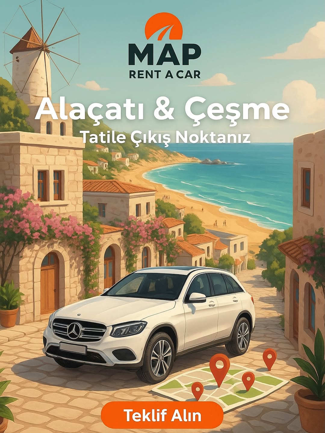 Konforlu, güvenilir ve hızlı bir hizmet arayanlar için Map Rent A Car, Alaçatı ve Çeşme bölgesinde ideal bir araç kiralama deneyimi sunmaktadır.